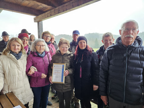 Im Anschluss an die Ehrung mit einer Urkunde und einem kleinen Geschenk sang der Chor für Klara Schlosser und ihre Familie einige Lieder, unter anderem die Chiemsee Hymne, die sie sich sehr wünschte. Mit Klara in ihrer Mitte verabschiedete sich der Chor dann mit dem Langenwanger Jodler und wünschte ihr und ihrer Familie alles Gute.